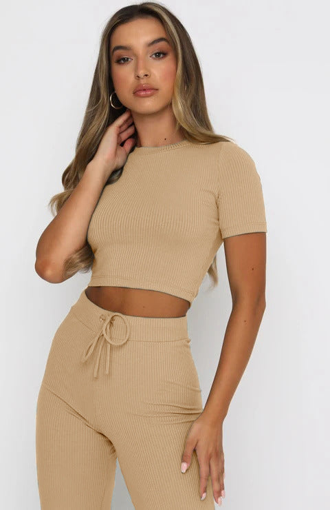 Fashion casual suit women's solid high elastic body shaping short sleeved wide leg pants two sets 5 colors
